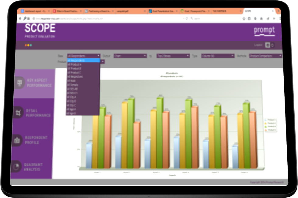 Our dashboard software will give you an easy way to look at different reactions from different target group. Help you in narrowing down your concept / product options by see it clearly through our rigorous method.